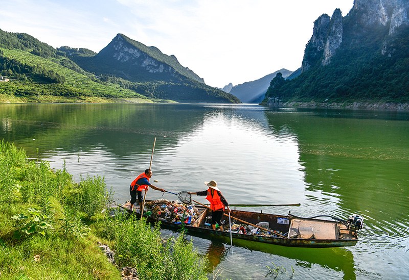 貴州省甕安縣珠藏鎮豐巖村村民盧錫永、冉茂英夫婦駕駛小船在烏江上打撈漂浮物(2023年7月10日攝)。新華社記者 楊文斌 攝