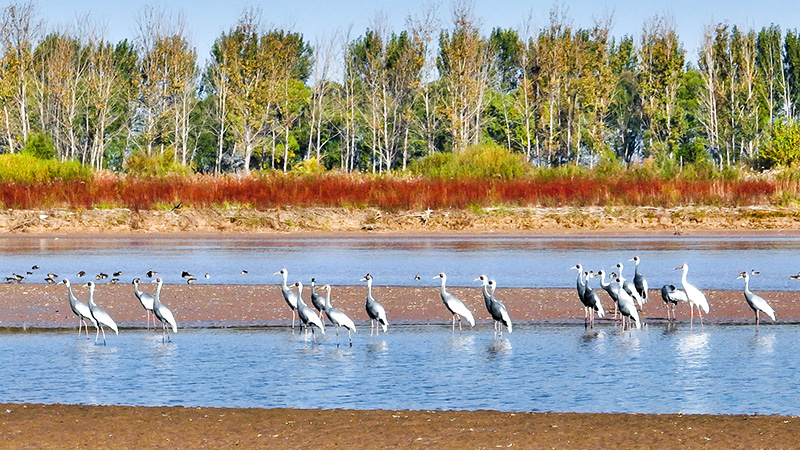 在山東黃河三角洲國家級自然保護區拍攝的白枕鶴(2022年10月18日攝)。新華社發(楊斌 攝)