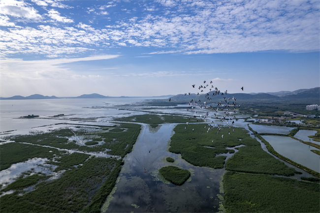 地遼天闊鳥競飛,平湖薄霧映晴暉。初冬時節,東平湖迎來首批南遷候鳥,它們時而漫步淺灘,時而翱翔天際,動與靜、力與美交織,染就一幅舒朗壯麗的天然景象。